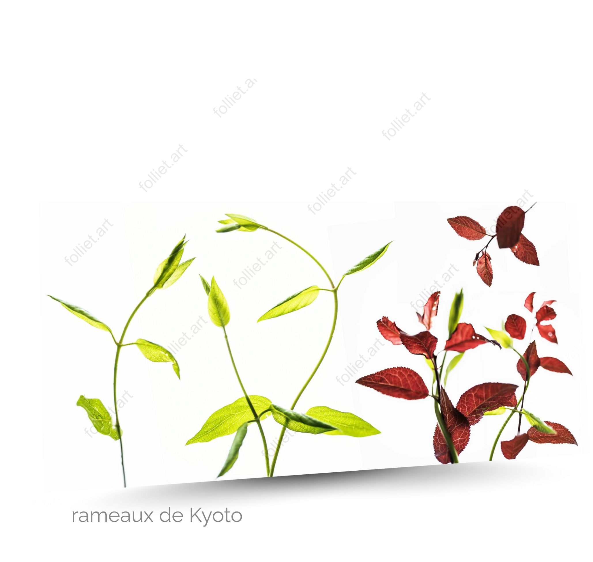 Ветви Киото: Ярко-зеленые и красные листья на белом фоне в стиле японской гравюры – художественная фотография Жана-Шарля Фолье