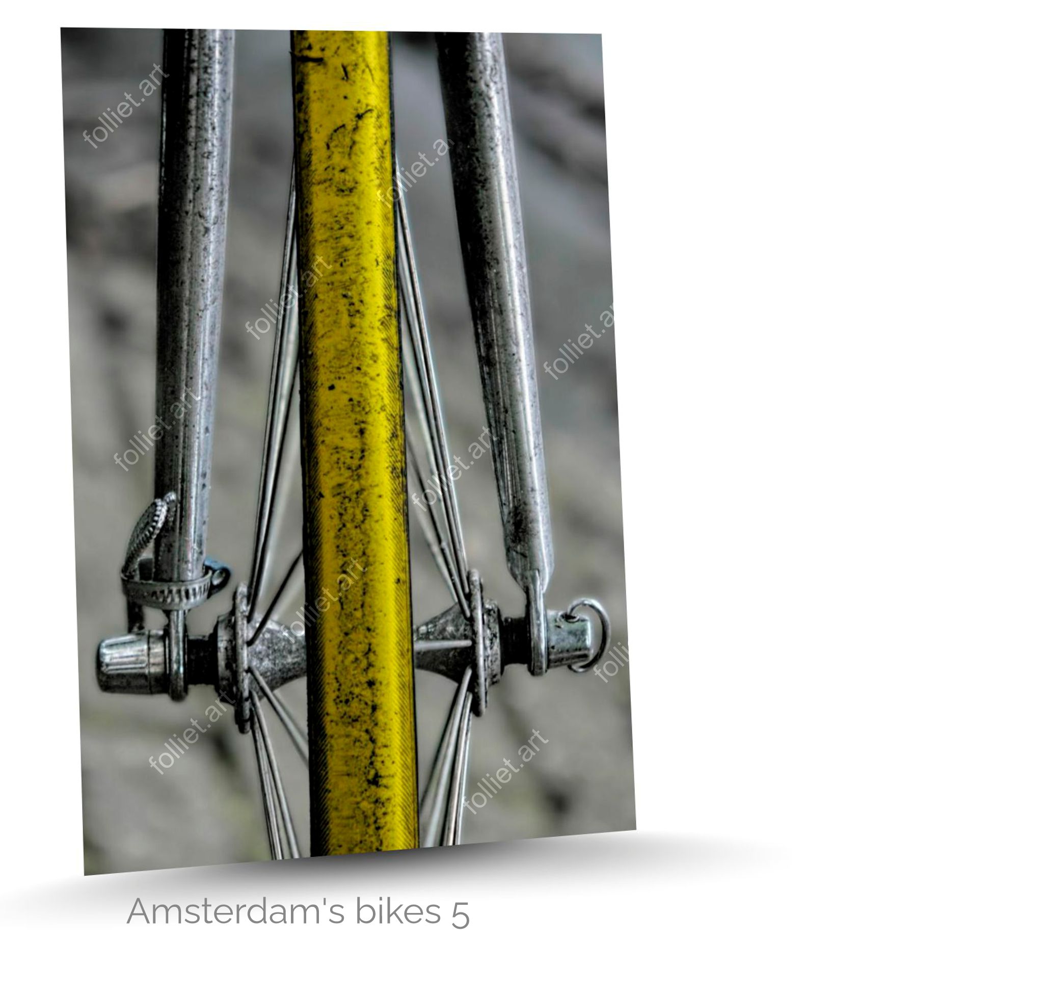 Amsterdam’s Bikes 5: एक चमकीले पीले रंग का साइकिल पहिया जिसमें जटिल स्टील के तीलियां हैं – जीन-चार्ल्स फॉलिएट द्वारा हस्ताक्षरित कला फोटोग्राफी