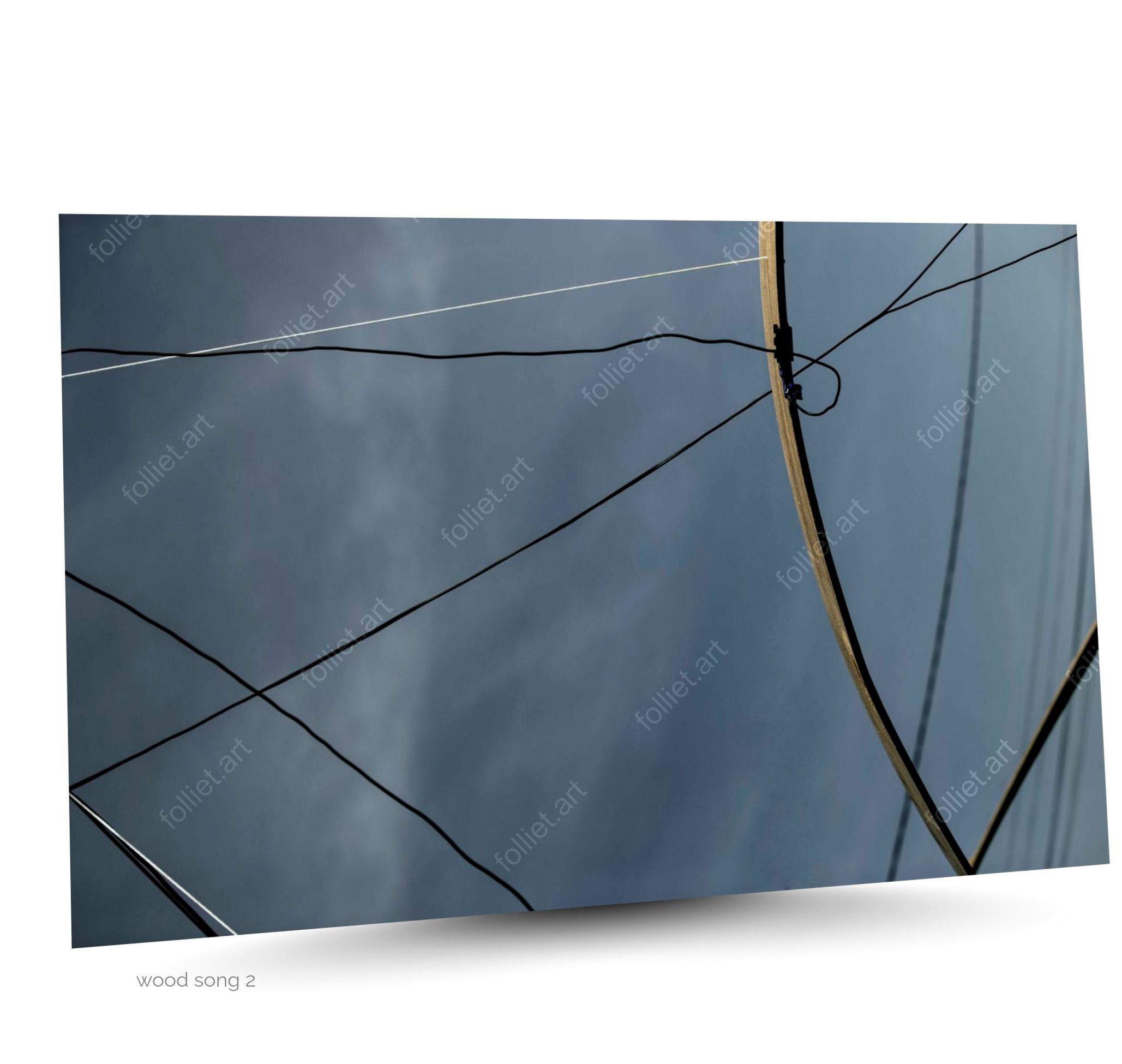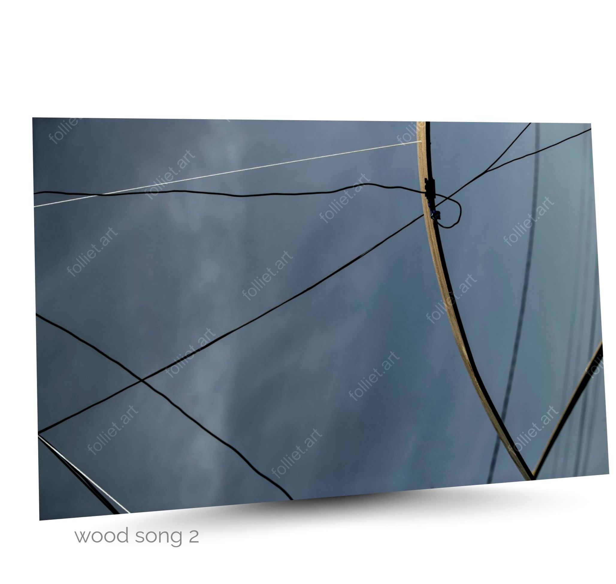 Wood Song 2: 抽象的なワイヤーと板が重なり合う曇り空の風景 – ジャン=シャルル・フォリエ署名のアート写真
