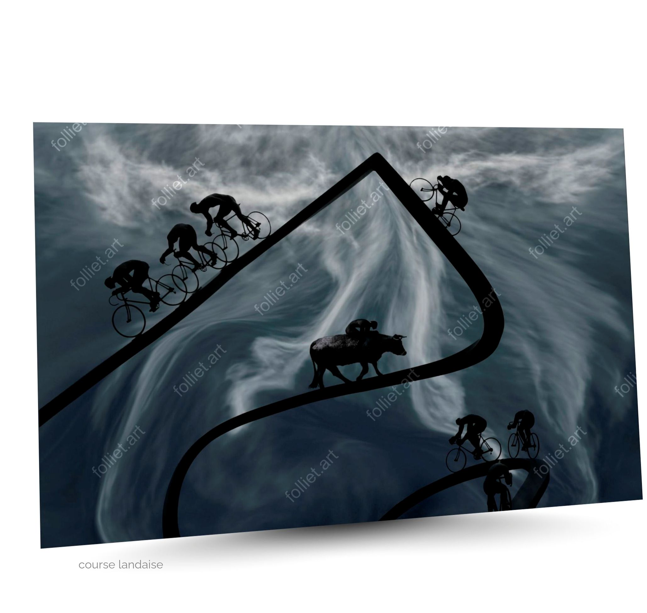 Course landaise: Ciclistas surrealistas y un toro en caminos abstractos sobre un fondo tormentoso – fotografía artística firmada por Jean-Charles Folliet