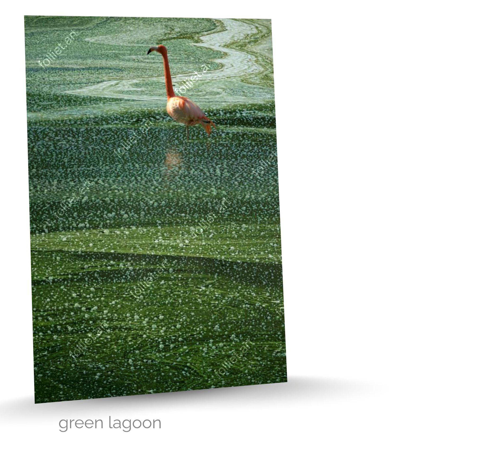 ग्रीन लैगून: एक अकेला फ्लेमिंगो एक चमकीले हरे जलीय परिदृश्य में खड़ा है – जीन-चार्ल्स फोलिए द्वारा हस्ताक्षरित कला फोटोग्राफी