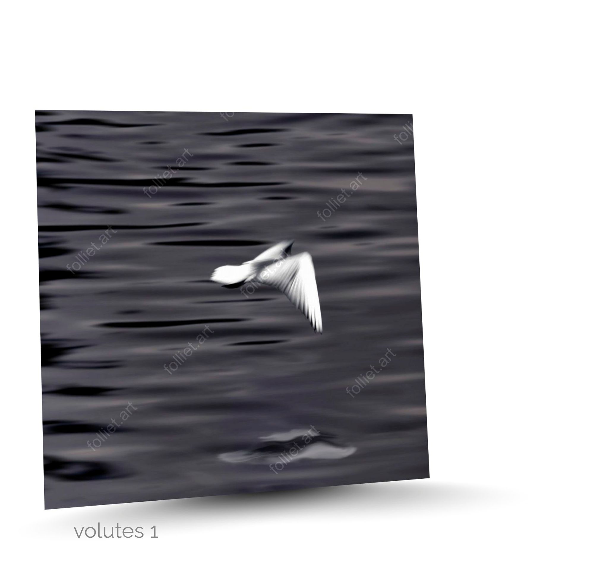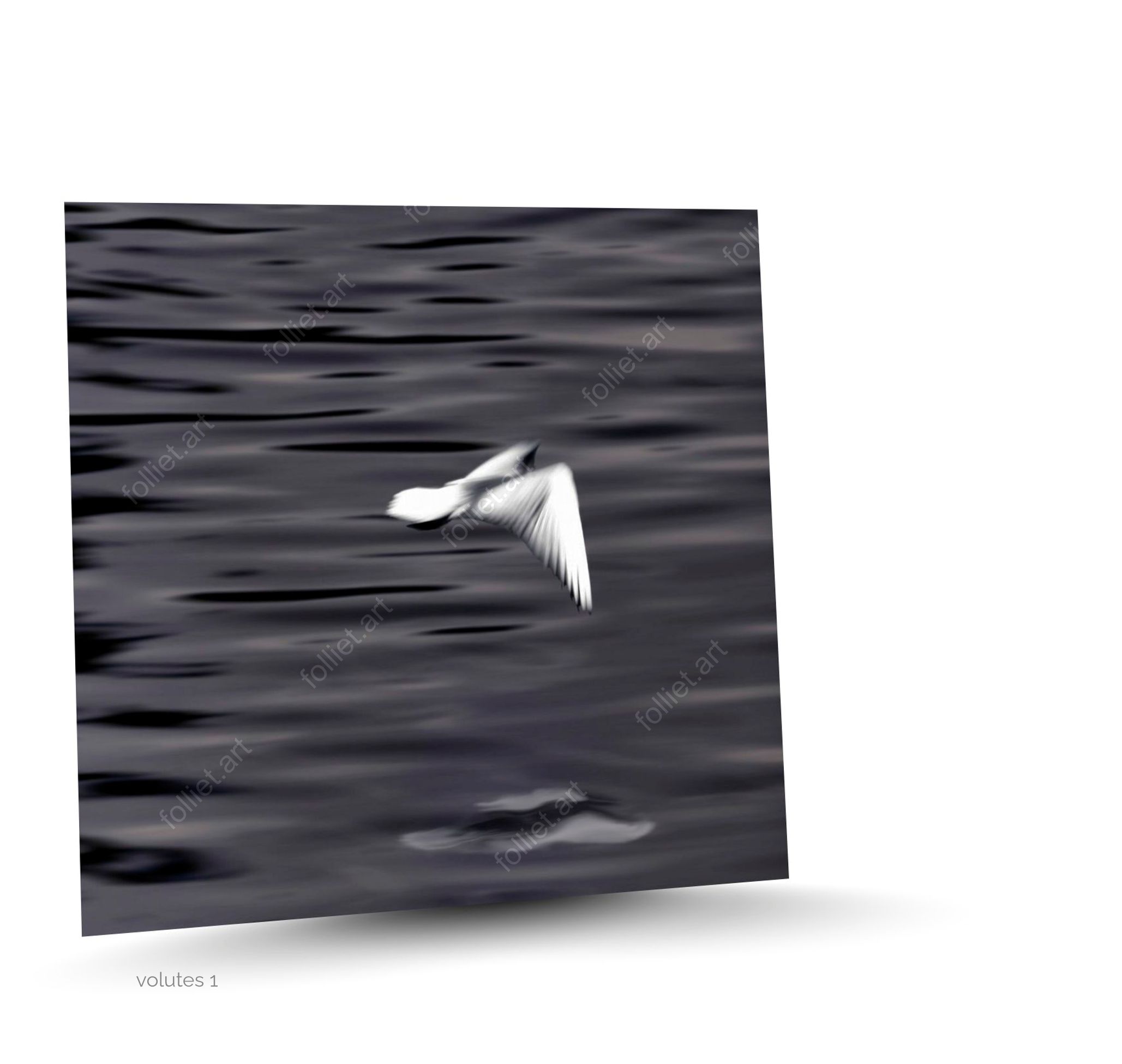 Volute 1: Vista monocromatica di un uccello in volo sopra acque calme – fotografia d’arte firmata Jean-Charles Folliet