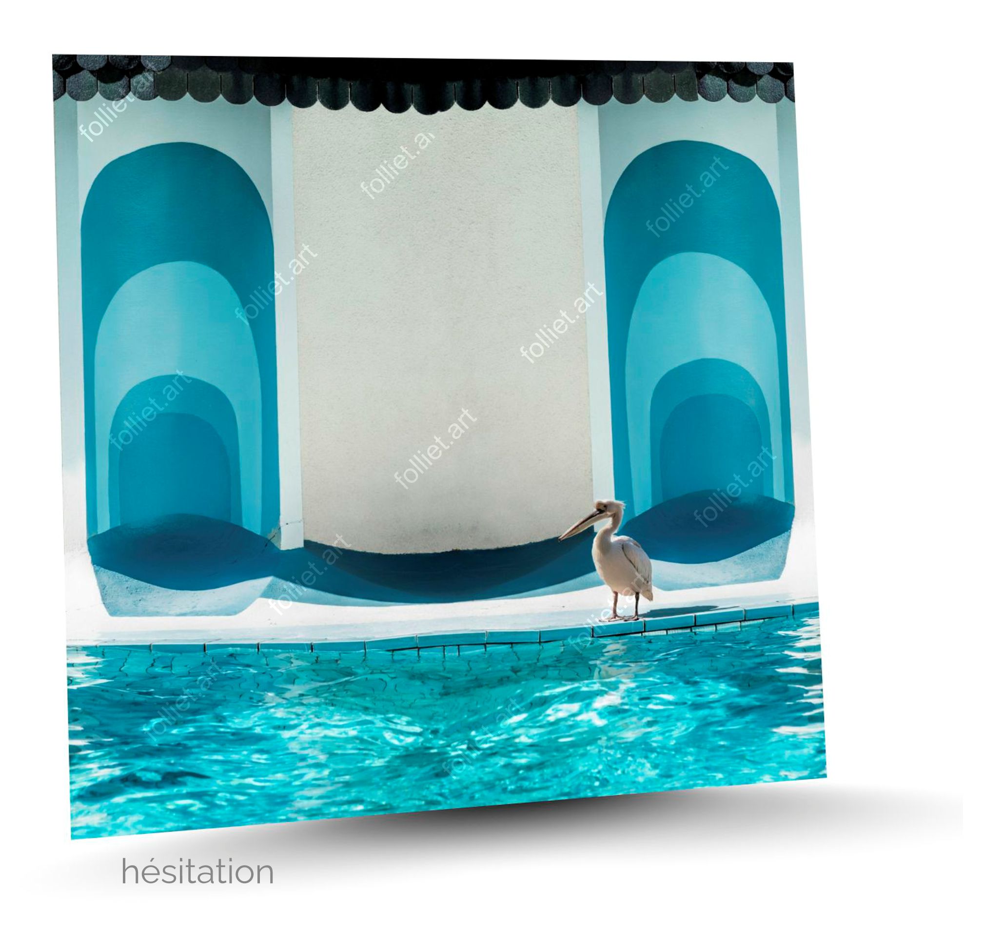 hésitation : Pélican élégant au bord de la piscine calme sur fond architectural vibrant – photographie d’art signée Jean-Charles Folliet