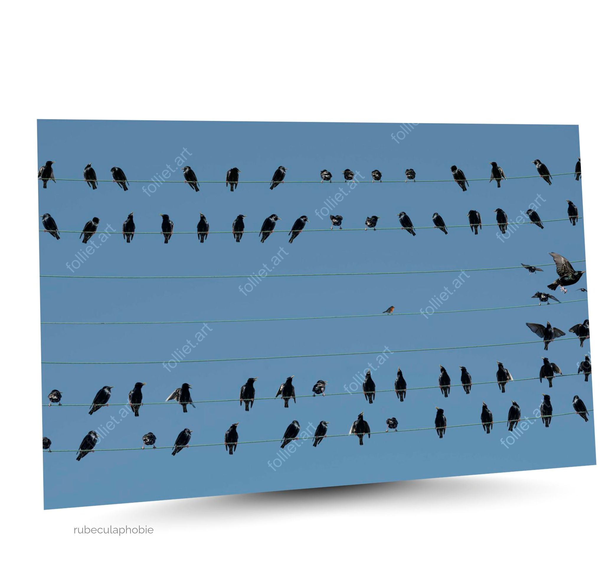 Рубекулафобия: Малиновка и стая птиц, сидящих на электрических проводах на фоне ясного голубого неба – художественная фотография, подписанная Жаном-Шарлем Фолье