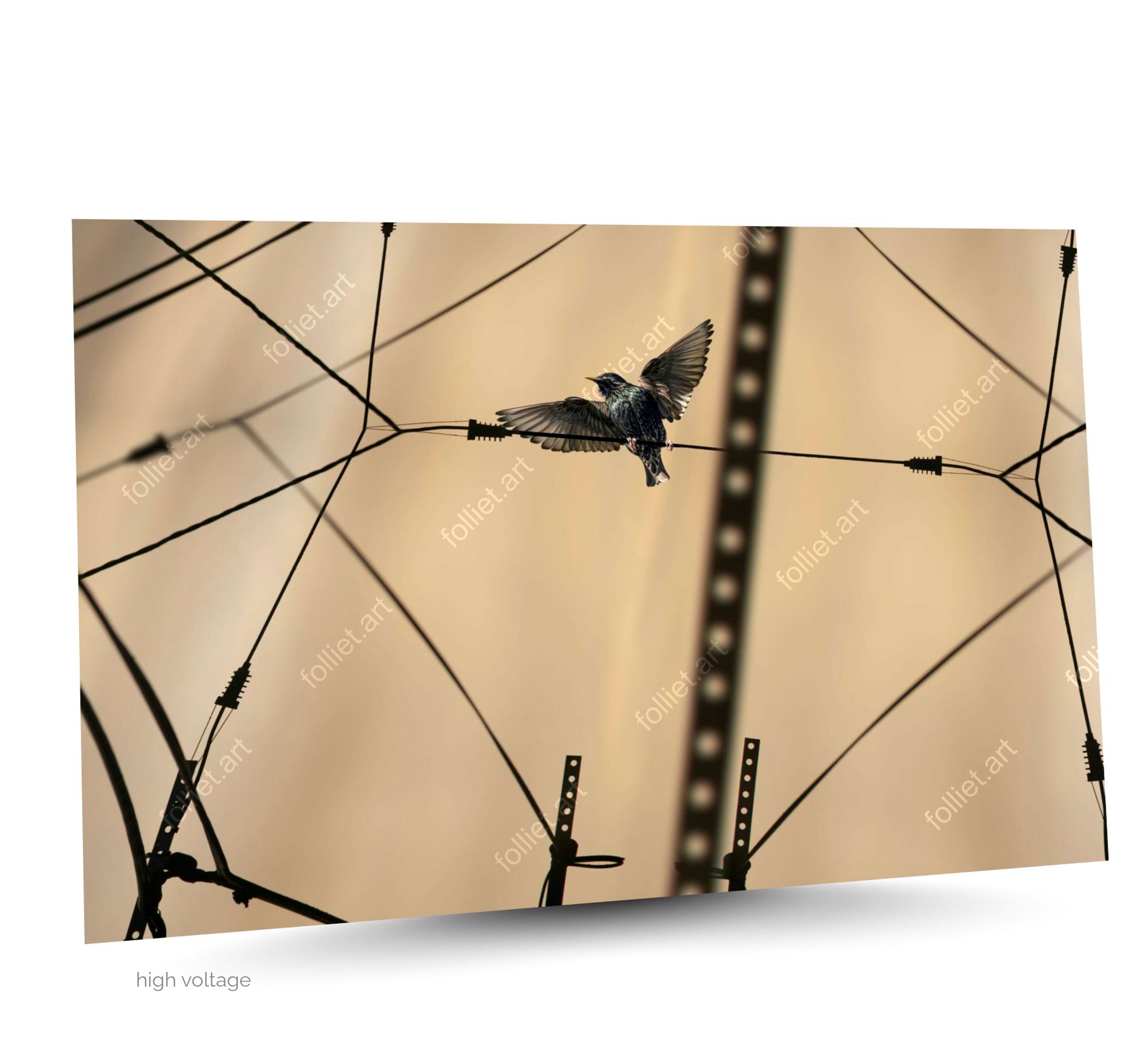 Oiseau sur câbles électriques tendus sur structure métallique – photographie d'art signée Folliet