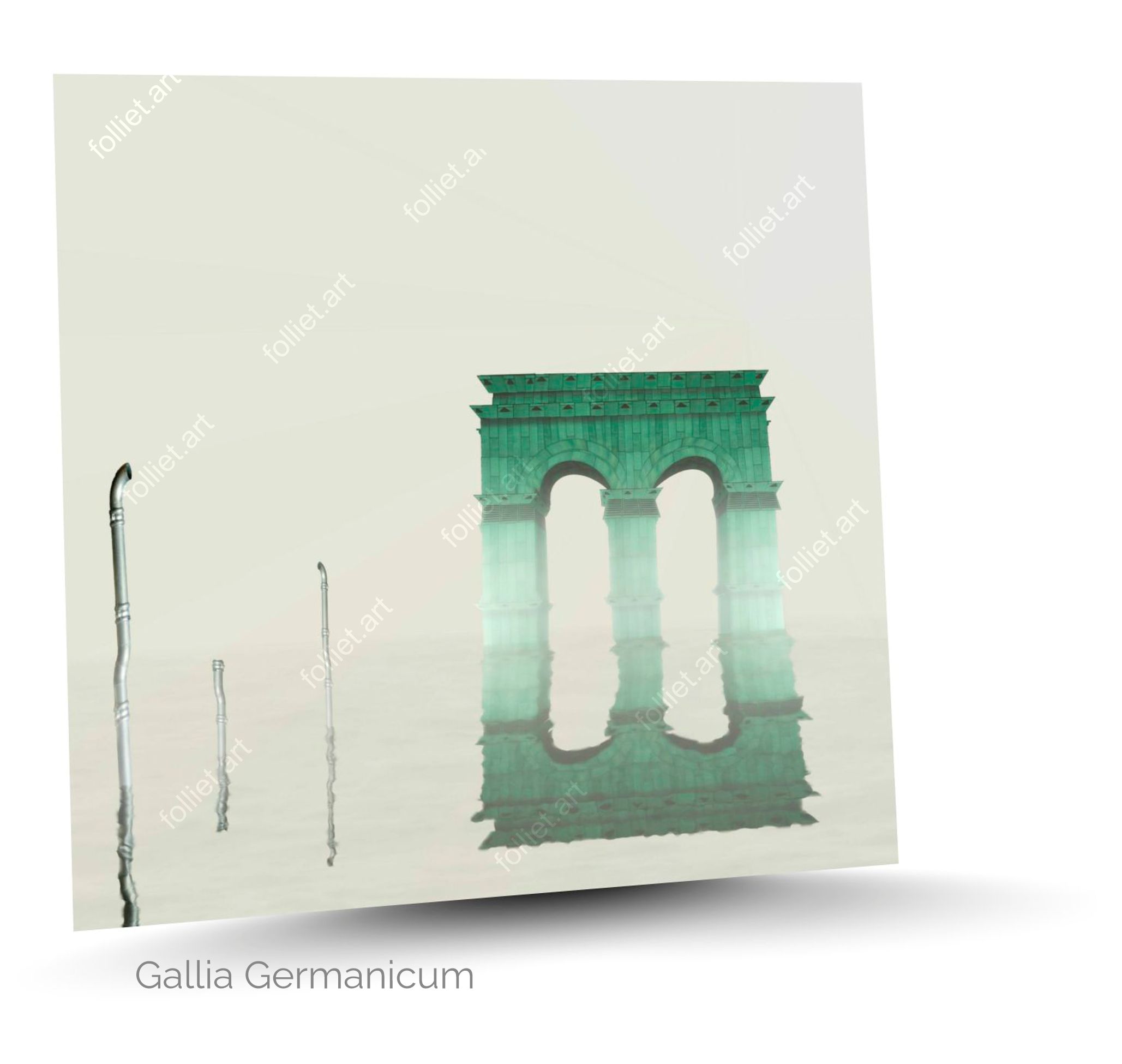 सेंट की असामान्य कल्पनाएँ, गालिया जर्मैनिकम, भव्य आर्च, प्राचीन संरचना, स्थापत्य प्रतिबिंब, शांत जल, धात्विक हरा, अवास्तविक वातावरण, दृश्य उलटाव, न्यूनतावादी सौंदर्य, स्वप्निल वातावरण, वैचारिक स्थापना, दृष्टि भ्रम, रुका हुआ समय, दृश्य कविता, भव्य एकांत, अतियथार्थवादी कला, एक हरा विजय द्वार सफेद कोहरे से घिरे परिदृश्य में खड़ा है, आंशिक रूप से डूबा हुआ, और जल में उसकी परछाईं पूर्णतः प्रतिबिंबित है, एक प्राचीन शैली की संरचना न्यूनतम दृश्य में आंशिक रूप से जलमग्न।