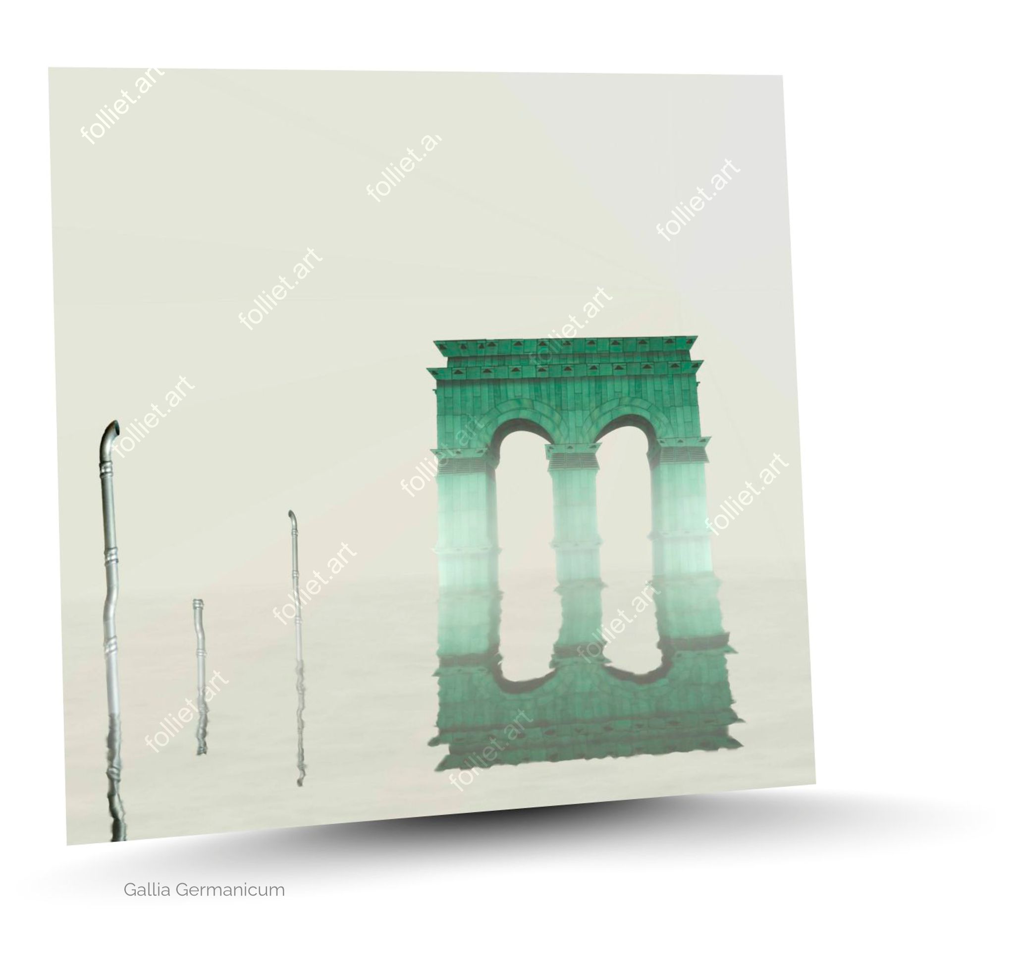 رؤى سانت الغريبة، Gallia Germanicum، قوس ضخم، هيكل أثري، انعكاس معماري، مياه ساكنة، أخضر معتق، جو غير واقعي، انعكاس بصري، بساطة بصرية، جو حلمي، تركيب مفاهيمي، وهم بصري، زمن مجمد، شعر بصري، عزلة معمارية ضخمة، فن سريالي، قوس نصر أخضر ينتصب في مشهد أبيض ضبابي، مغمور جزئياً، مع انعكاسه الكامل على سطح الماء، هيكل معماري على الطراز القديم غارق جزئياً في مشهد بصري بسيط.