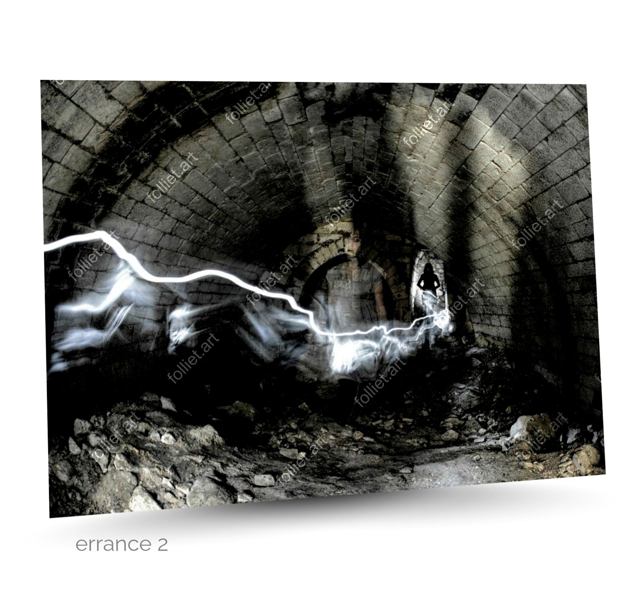 Figure fantomatique dans souterrain voûté, fil de lumière comme énergie en mouvement – photographie d'art signée Folliet