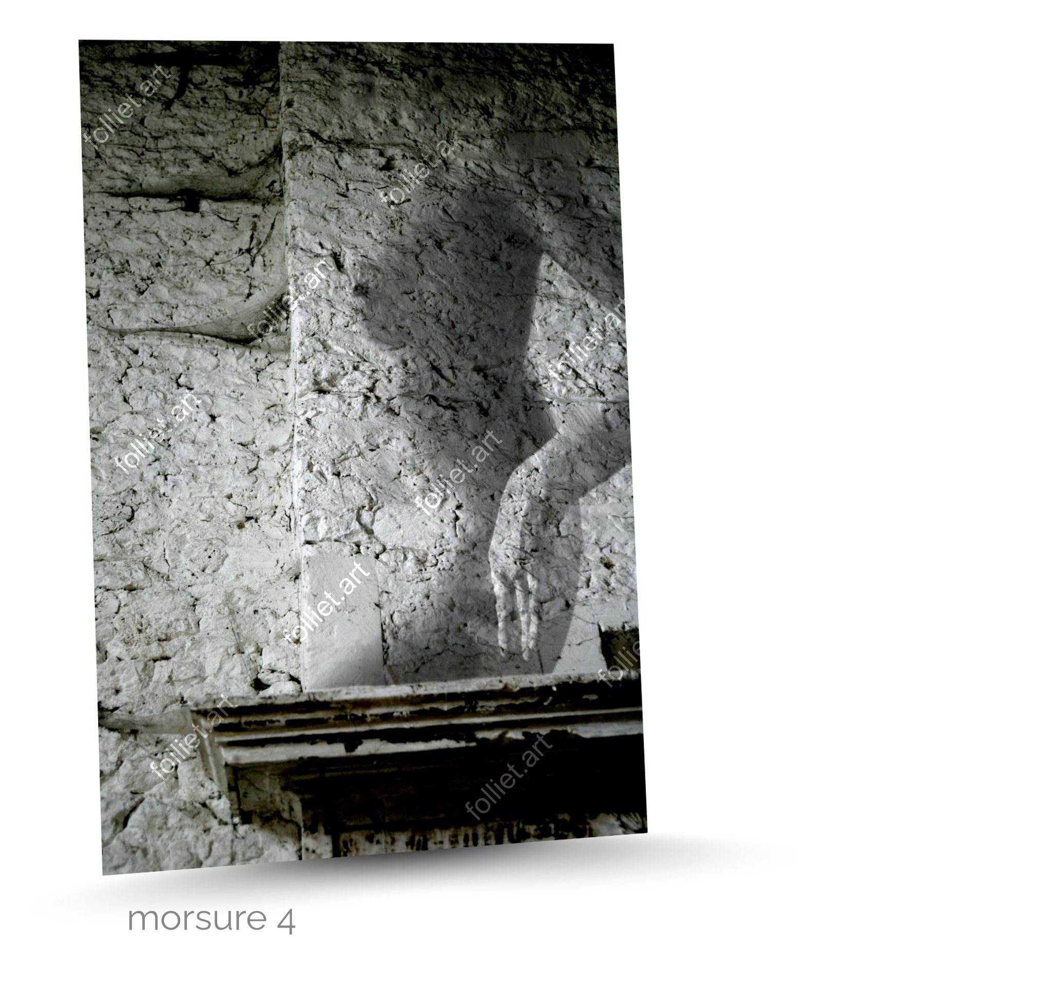 Morsure 4、テクスチャのある壁、投影された影、女性のシルエット、示唆された裸体、女性の体、視覚的投影、かすかな光、白い石、古い壁、無加工の素材、影の遊び、消えゆく存在、光と影のコントラスト、身体の錯覚、幽霊のような雰囲気、石の壁に映し出された裸の女性の影、ディディエ・ドゥラノワ、画家。