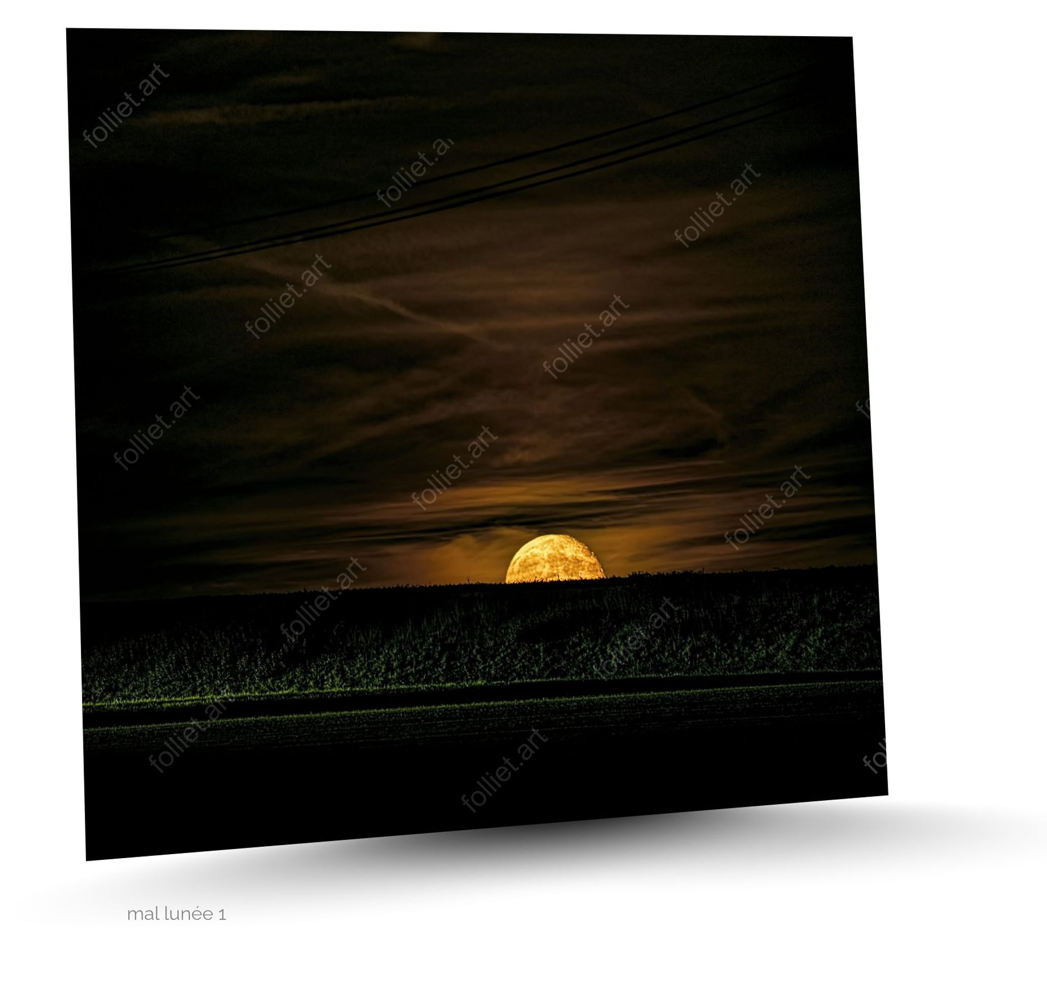 बुरा मूड 1: एक सुनहरे चाँद के साथ शांत रात का दृश्य, जो खेतों के ऊपर उग रहा है, और हेडलाइट्स जलती हुई एक कार के गुजरने का दृश्य – जीन-चार्ल्स फोलिएट द्वारा हस्ताक्षरित कला फोटोग्राफी