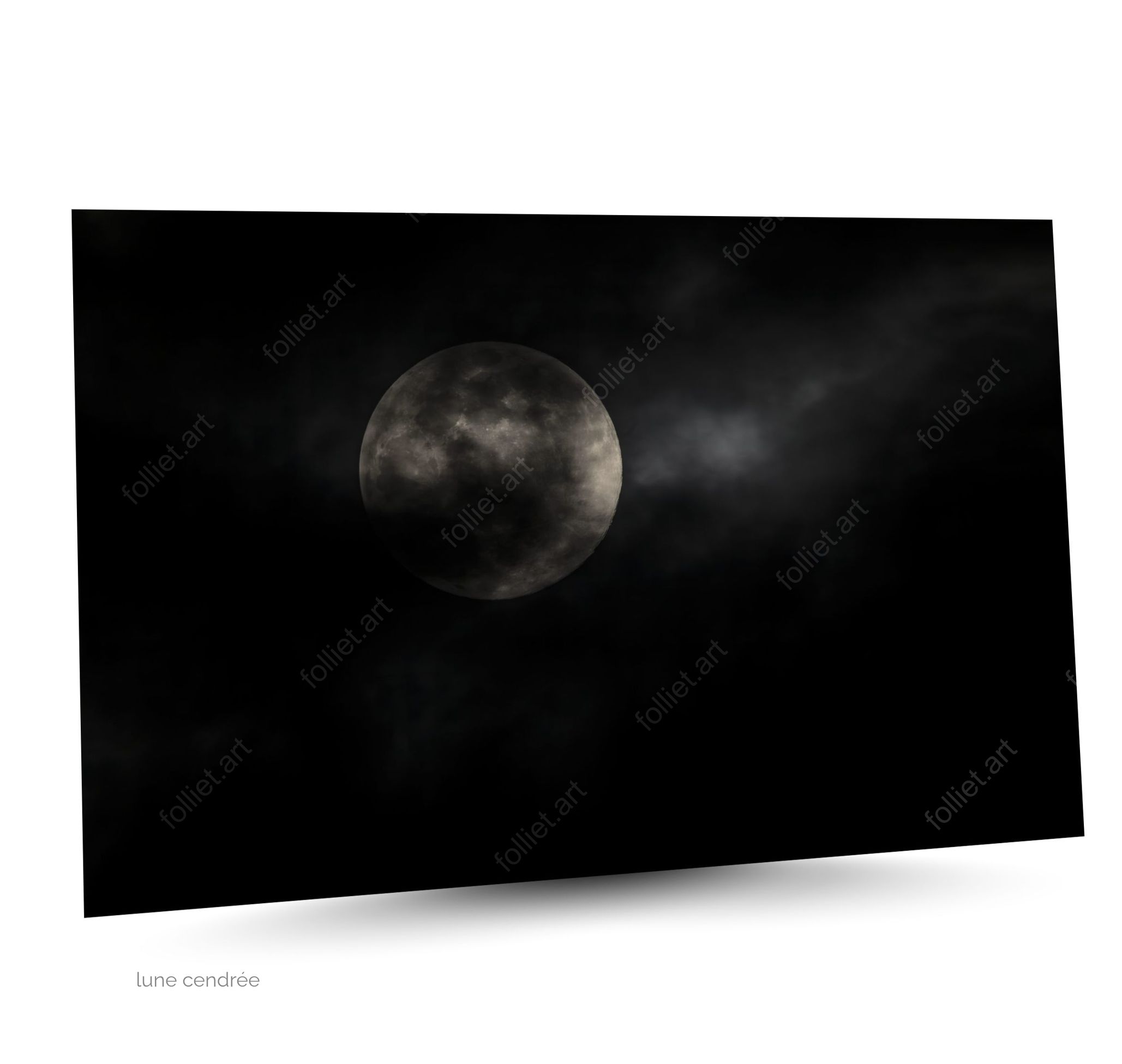 lune cendrée : Nuit nuageuse sombre avec pleine lune partiellement obscurcie par les nuages – photographie d’art signée Jean-Charles Folliet